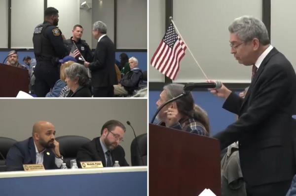 园林设计师拉斯·阿扎雷洛(Russ Azarello)走到讲台上,手里拿着几面像巴索夫一样的小美国国旗,他告诉委员会,他“无法理解有人拿着宪法或国旗……怎么会扰乱会议。”