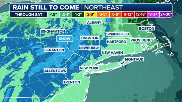 预计东北部和新英格兰地区的总降雨量将保持在1-2英寸的范围内,尽管局部地区的降雨量可能达到2-3英寸或更多。