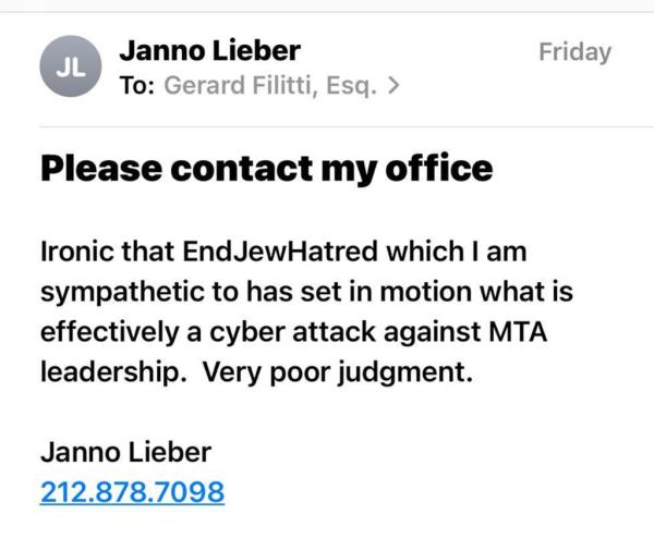“讽刺的是,我同情的‘终结犹太人仇恨’已经启动了一场针对大都会运输署领导层的网络攻击。“非常糟糕的判断,”MTA主席兼首席执行官利伯在3月8日给民权律师兼#EndJewHatred活动家杰拉德·费利蒂(Gerard Felitti)的电子邮件中说。