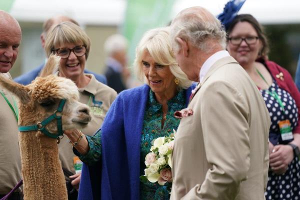 国王和王后抚摸着羊驼,卡米拉在观看农业表演的精彩片段时,对一只山羊啃她的裙子一笑了之。