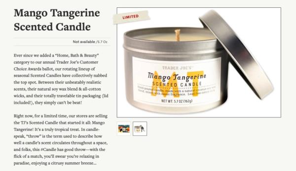 Trader Joe 's周四宣布,由于“意外燃烧模式”带来的“安全风险”,该公司正在全国紧急召回约65.3万支芒果橘子香氛蜡烛。
