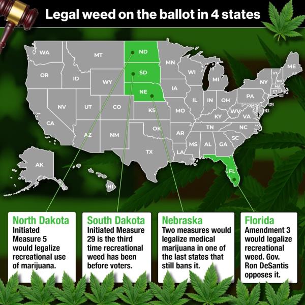 佛罗里达州、北达科他州和南达科他州的选民正在进行投票,询问他们是否希望将娱乐用途的大麻合法化——这意味着美国最后一批拒绝禁止古怪烟草的人可能最终会走向绿色。