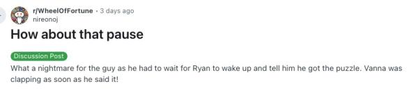 在Reddit的一个标题为“暂停一下怎么样”的帖子中,最初的发帖人写道:“这家伙真是噩梦,因为他不得不等瑞安醒来,告诉他他找到了谜题。”