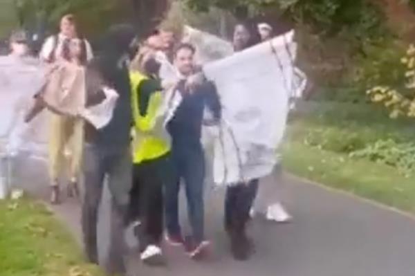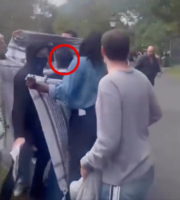X show网站上发布的视频显示,有超过6名示威者手持keffiyeh(传统的巴勒斯坦头巾)蒙住这名学生的脸,包围了他,阻止他逃跑。