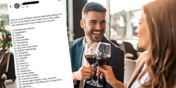 “这里列出了女性绝对拒绝第一次约会的地方,”帖子说,然后承认其他女性在记录中加入了他们的建议。