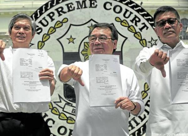 “垃圾IT”巴扬穆纳主席内里·科尔曼纳雷斯(中)和前巴扬穆纳代表卡洛斯·伊萨加尼·萨拉特(右)、费迪南德·盖特向记者展示了他们向大法院提出的“2023年马哈里卡投资基金法违宪”的请愿书。(资料图片来自RICHARD A. REYES)