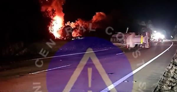 半挂车着了火,被大火烧毁了。
