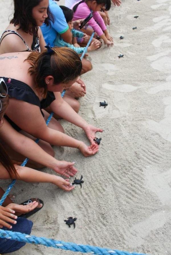 这张照片摄于2月2日,在苏比克湾,全员海滩的游客将几只小橄榄蠵龟放飞。(提供照片)