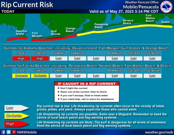 位于莫比尔的国家气象局警告阿拉巴马州的海滩游客要小心离岸流,并将周六剩余时间的离岸流风险从中等提高到高,这是最严重的类别。