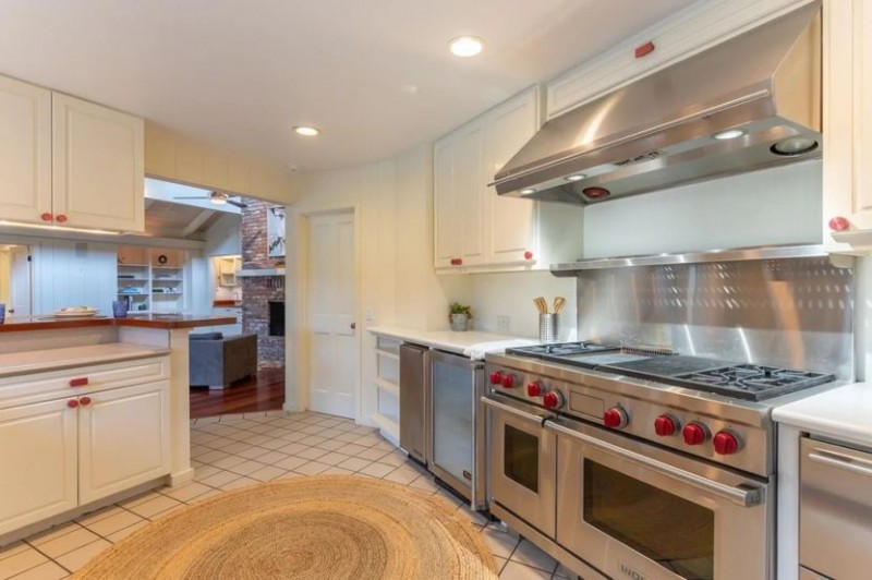 一间有三个座位的早餐吧台正对着厨房,厨房里设备齐全,配备了不锈钢电器和彩绘橱柜。一间带第二座壁炉的家庭办公室和家庭娱乐室毗邻烹饪空间,硬木地板和天窗将布局联系在一起。