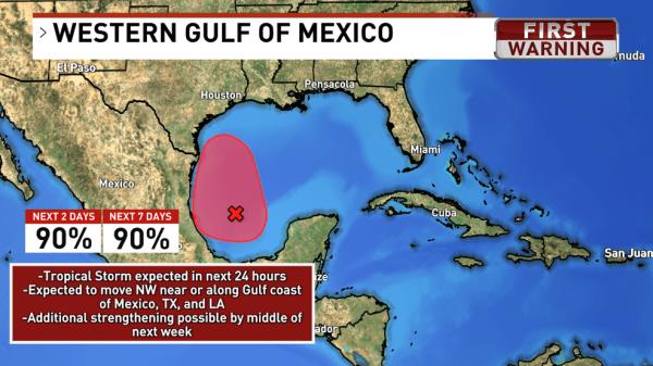 预计该扰动将在未来几天缓慢向北移动。预计环境条件将变得更加有利于发展,并预计在接下来的24小时内形成一场热带风暴,而该系统将在下周中期大致向北移动,靠近墨西哥湾沿岸的墨西哥和德克萨斯州,并在路易斯安那州的某些地方产生直接影响。